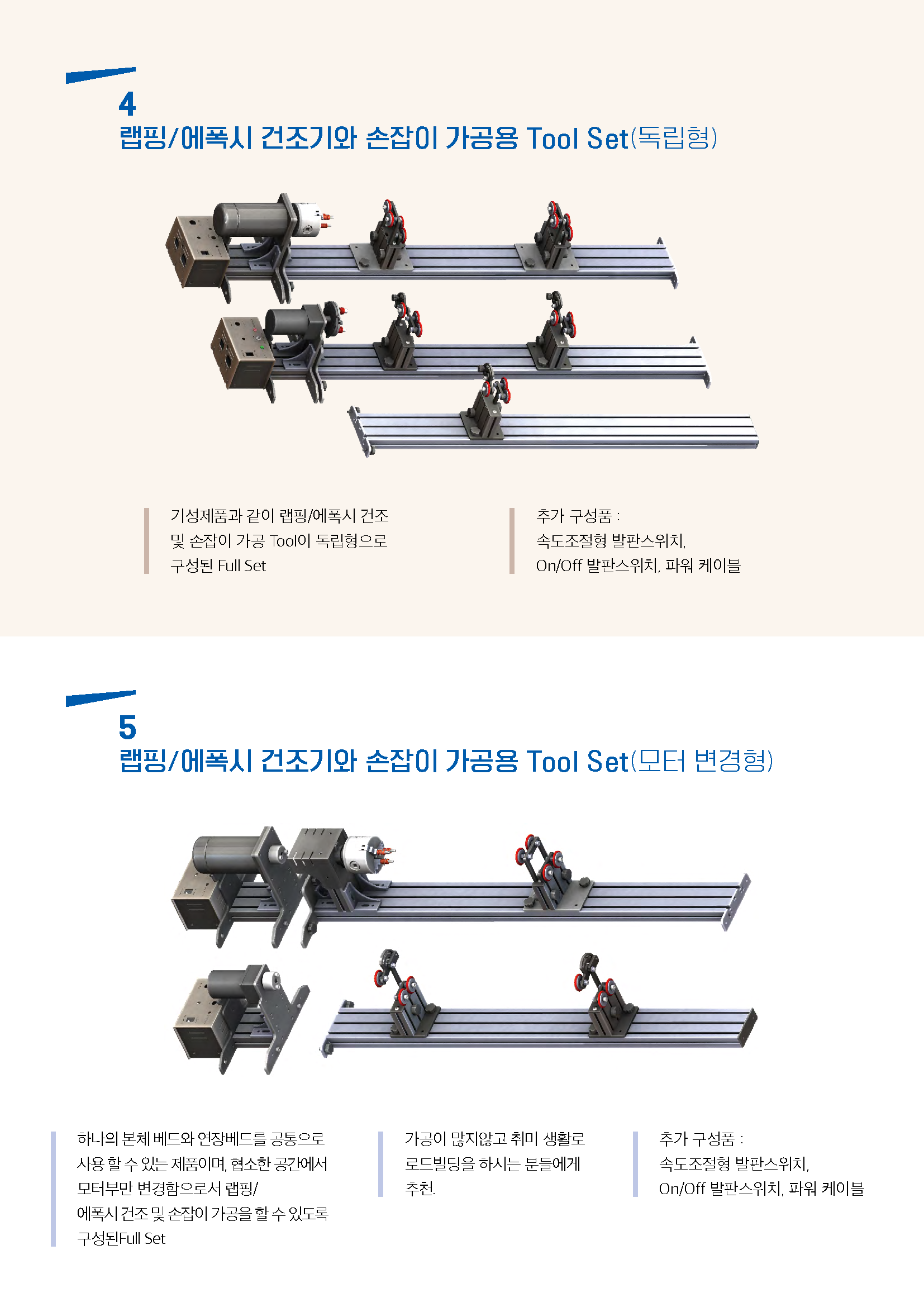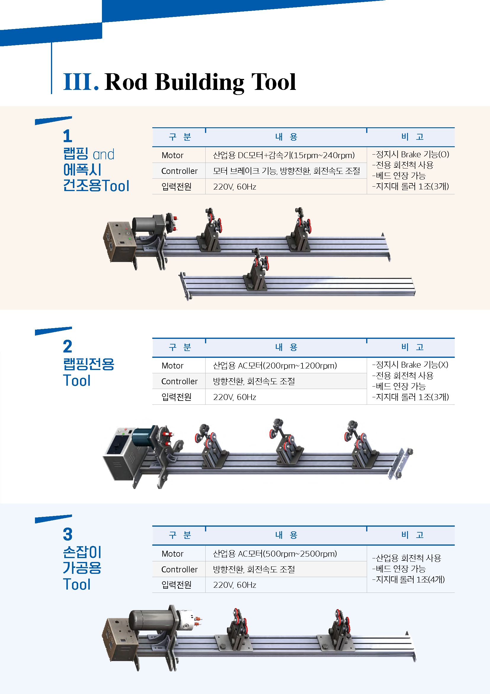 제품은 저속(에폭시 건조, 랩핑)과 고속(콜크가공)에 두가지 제품으로 구성되며, 기본적인 기능으로 저속은 회전속도 조절(기본20~200rpm)이고 고속은 50~2500rpm이며, 발판스위치 사용가능, 회전방향 변환, 브레이크 기능(저속)과 주문에 요청에 따라 감속비를 높이거나 줄여서 출시 가능합니다.