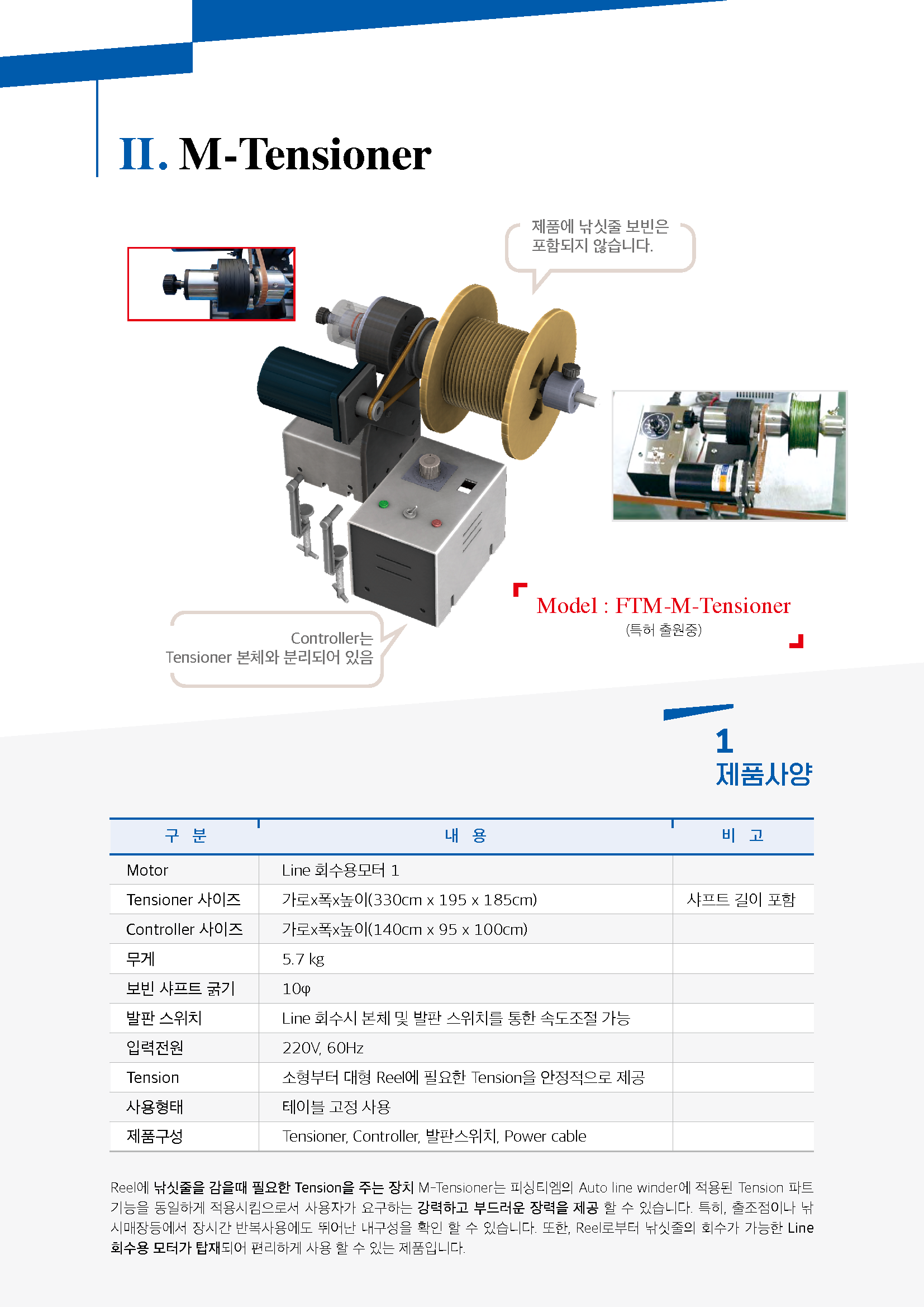 M-Tensioner제품은 오토라인와인더의 텐션부분 특성을 독립적으로 살려서 강력하고 부드럽게 제공해주는 장치로서 현재 시중에 출시되고 있는 제품 중에는 내구성과 텐션력이 가장 강력합니다. 각종 전동릴 외에도 다양한 어종을 상대하는 개인은 물론 뛰어난 내구성으로 라인관리가 필요한 낚시매장, 출조점에서도 장시간 사용 가능합니다.